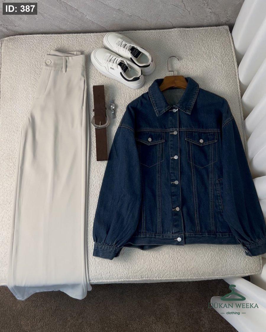 تنسيقة جاكيت جينز غامق + بنطلون بيج + قشاط