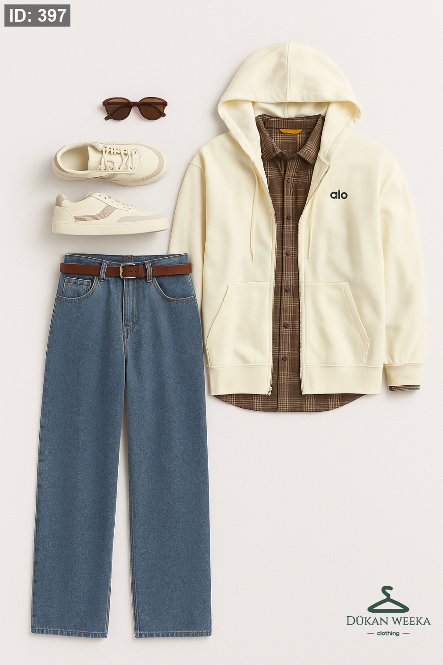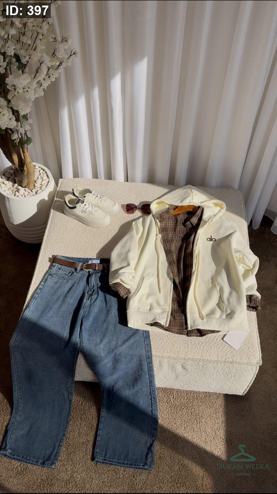 تنسيقة جكيت alo+قميص كروهات +بنطلون وايد ليج