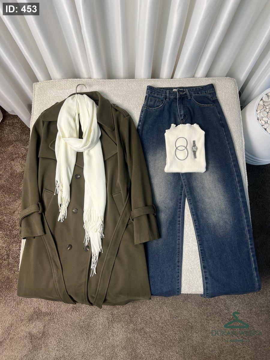 تنسيقة ترانش + بنطلون + سكارف + توب